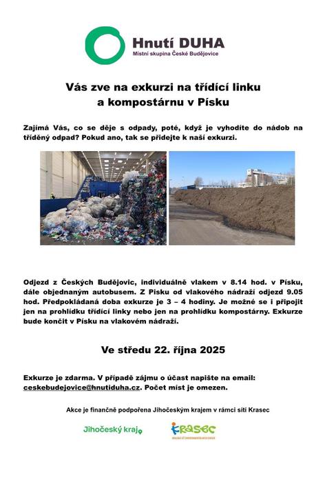 Odjezd z Českých Budějovic, individuálně vlakem v 8.14 hod. v Písku, dále objednaným autobusem. Z Pisku od vlakového nádraží odjezd 9.05 hod. Předpokládaná doba exkurze je 3 – 4 hodiny. Je možné se i připojit jen na prohlídku třídící linky nebo jen na prohlídku kompostárny. Exkurze bude končit v Písku na vlakovém nádraží.