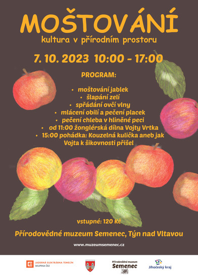 7. října Vás Přírodovědné muzeum Semenec srdečně zve na podzimní oslavu úrody, plných sklepů, kypících díží, plných hrnců a sýpek. Přidejte se k nám a přijďte si vyzkoušet, jak se lisuje mošt, mlátí a mele obilí, peče chleba, češe vlna a šlape zelí. Bude práce a bude i zábava - zavítá k nám Vojta Vrtek a jeho kejklířské představení, následované žonglérskou dílnou pro každého a odpolední pohádkou. Oheň, pečená jablka a prima podzimní pohoda