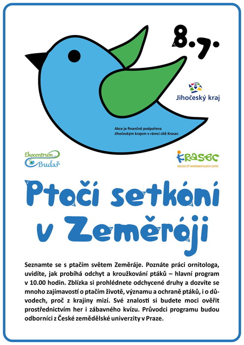 Přijďte se seznámit s ptačím světem Zeměráje. Poznáte práci ornitologa, uvidíte, jak probíhá odchyt a kroužkování ptáků – hlavní program od 10 hodin. Zblízka si prohlédnete odchycené druhy a dozvíte se mnoho zajímavostí o ptačím životě, významu a ochraně ptáků, i o důvodech, proč z krajiny mizí. Své znalosti si budete moci ověřit prostřednictvím her i zábavného kvízu. Průvodcem programu bude docent Petr Musil a doktorka Zuzana Musilová z ČZU v Praze.