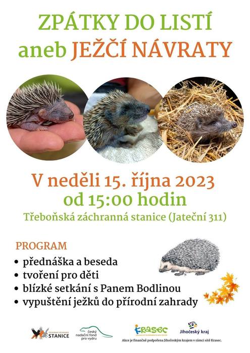 Sraz je v v neděli 15.10.2023 v 15 hodin v Třeboňské záchranné stanici pro živočichy, Jateční 311, Třeboň.